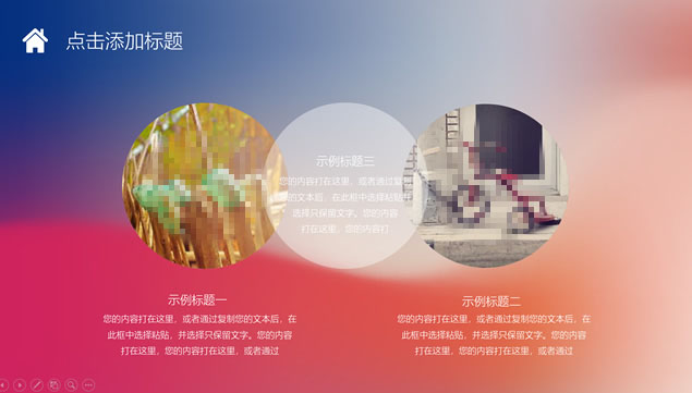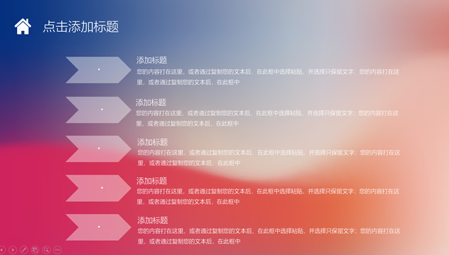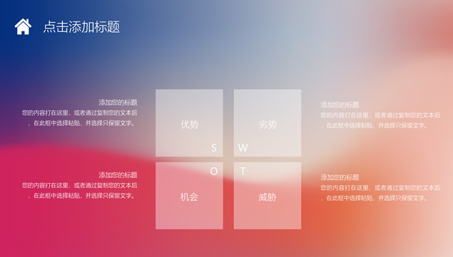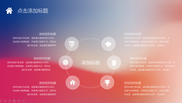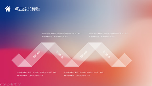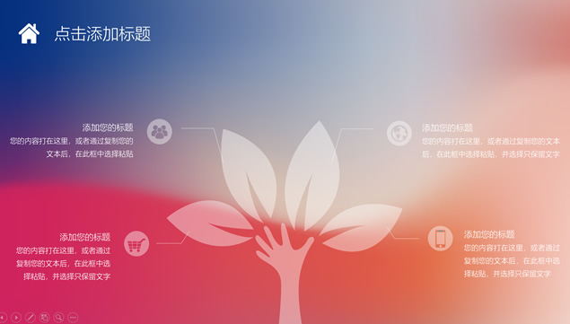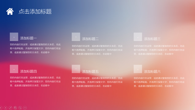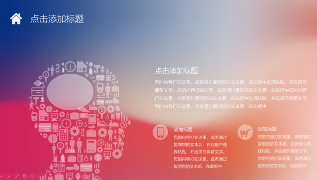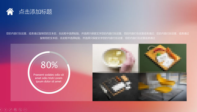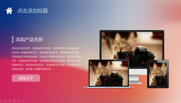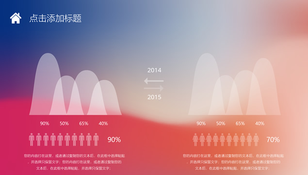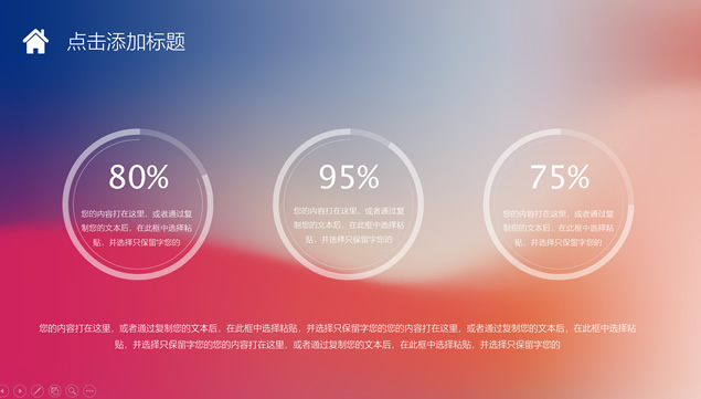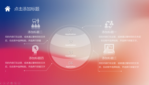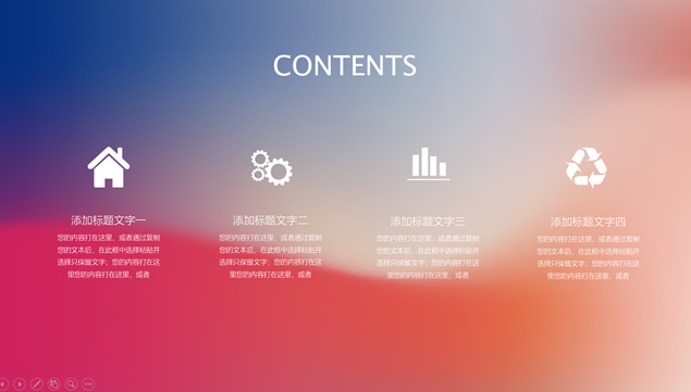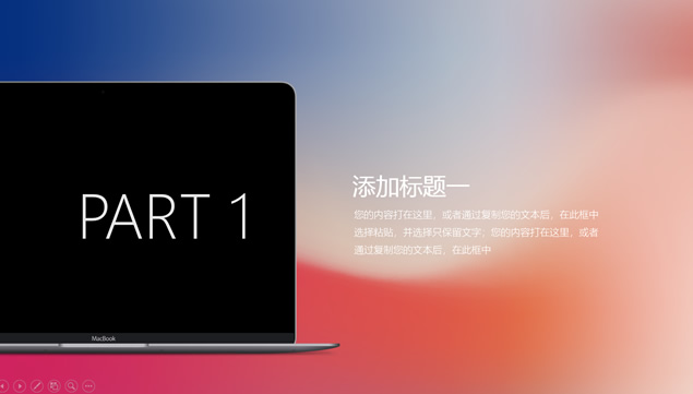 简介:蓝紫橙渐变模糊朦胧背景,半透明圆极简文字创意封面,笔记本、手机苹果系列产品配图,半透明图表,简约大气设计,适合商务工作汇报、工作总结报告等场景应用的iOS风格主题ppt模板。